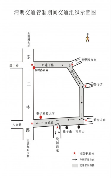 三、通行方向:管制路段內(nèi)的機(jī)動(dòng)車(含公交車)一律由建干路北段進(jìn)入,經(jīng)靈田公路