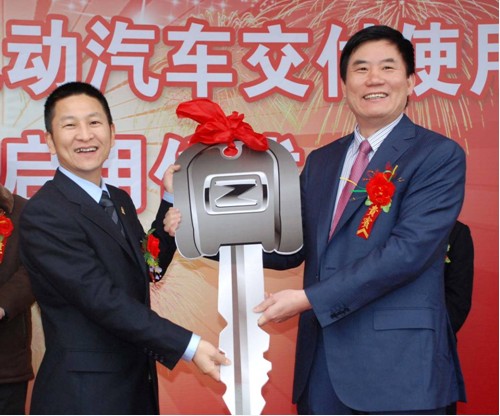 眾泰控股集團董事長吳建中向永康市供電局局長汪志奕交付車輛鑰匙