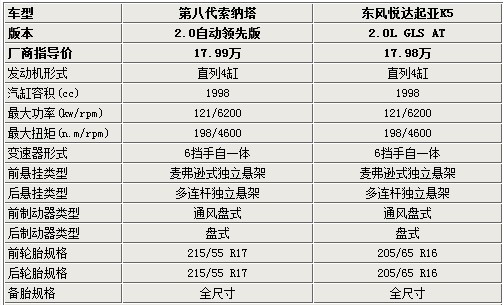 第八代索納塔與東風(fēng)悅達(dá)起亞都采用相同的直列四缸發(fā)動機(jī),最大功率為121kw/6200rpm,6速手自一體變速箱。換擋時(shí)更加平順,有效了提高乘坐上的舒適性。兩車在底盤與剎車的配置方面完全相同,前后懸掛在這個價(jià)位合資車中還算可以接受,前后盤剎的配置可以有效提升駕駛安全性。前后的輪胎規(guī)格稍有不同,并且兩款車都配備了全尺寸備胎。