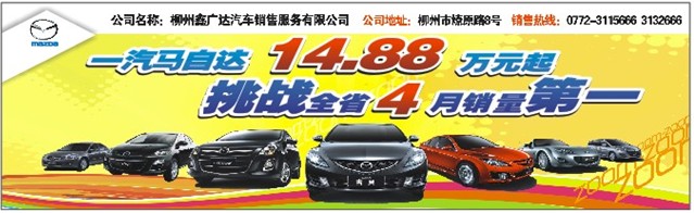 正值一汽馬自達(dá)柳州鑫廣達(dá)3周年店慶,4月大型車展即將拉開(kāi)帷幕。小編從柳州鑫廣達(dá)了解到,為回饋廣大客戶對(duì)一汽馬自達(dá)的關(guān)注和支持,車展期間,馬六14.88萬(wàn)元起售,購(gòu)車即送1000元油費(fèi)。