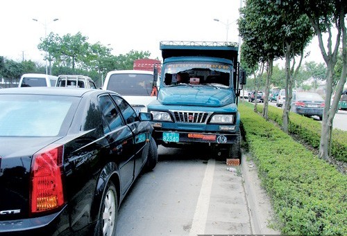 當日上午11時許,記者來到秀廂大道金源汽車城附近路段,見到車流一片擁堵。道路中橫七豎八地停著幾輛車,有的車頭已被撞凹。在綠化帶邊,停有一輛滿載紅磚的農(nóng)用車。農(nóng)用車被一輛金杯車和一輛凱迪拉克轎車前后夾住,農(nóng)用車的車窗已粉碎。農(nóng)用車上坐著一名女子,她驚魂未定地說,有人襲擊他們。