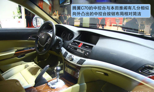初看之下騰翼C70的中控臺(tái)與本田雅閣有幾分相似,向外凸出的中控臺(tái)按鈕布局簡潔,出風(fēng)口移到了液晶顯示屏的下方,而概念版中控臺(tái)出風(fēng)口在娛樂控制按鍵的兩側(cè)。另外,騰翼C70還采用了一些桃木飾板,其定位明顯更偏向于商務(wù)化。