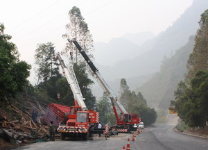 據(jù)了解,河池市交警部門在26日凌晨零時07分接到事故報警后,立即趕到現(xiàn)場。經(jīng)過現(xiàn)場查看及詢問生還者后發(fā)現(xiàn),大貨車駕駛室內(nèi)的駕駛員已經(jīng)死亡,而大貨車傾倒下來的木材堆里,隱約可見一具成人的身體?墒怯捎谑掳l(fā)深夜,且皮卡車被死死壓在大貨車下,皮卡車車廂內(nèi)的情況完全看不清楚,也無法得知皮卡車內(nèi)的乘員是否生還。交警緊急協(xié)調(diào)兩輛吊車趕到現(xiàn)場,并請來數(shù)名工人,將傾倒的木材清理開。同時,利用吊車把大貨車車頭抬起。直至凌晨5時許,才把壓在大貨車下的皮卡車拖出。很不幸,完全變形的皮卡車車廂內(nèi)的兩名大人及一名兒童已經(jīng)沒有了呼吸。