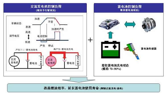 從上圖中可以看出,有了AMS電源管理系統(tǒng),發(fā)電機(jī)可以通過電流傳感器測(cè)定電瓶狀態(tài),根據(jù)車輛駕駛條件改變發(fā)電機(jī)的負(fù)荷,控制電瓶充電和放電,從而改善油耗,同時(shí)還能延長(zhǎng)蓄電池使用壽命。