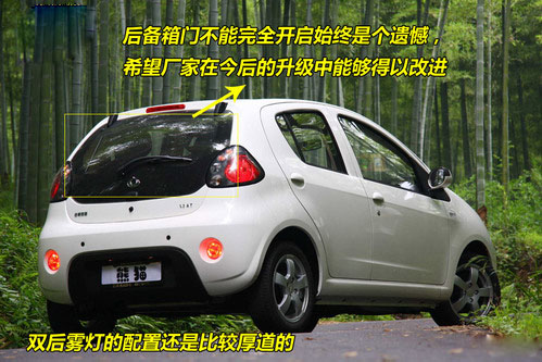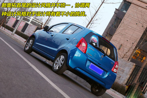 新奧拓的流暢的線條從車頭拉升到車頂,在經(jīng)過高位剎車燈之后,以近乎垂直于地面的方式來完成收尾,這種做法感覺稍顯生硬。而有些臃腫的尾燈和過于寬厚的后保險杠,讓新奧拓尾部的造型和車頭有些不夠協(xié)調(diào)。