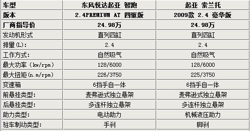 兩款車均采用了直列四缸發(fā)動(dòng)機(jī),六擋手自一體變速箱。前懸掛采用轎車常見(jiàn)的舒適性和操控性較好的麥弗遜式懸掛,后部采用舒適性效果好的多連桿式懸掛,令乘坐舒適,駕駛操控穩(wěn)定。智跑采用電動(dòng)助力系統(tǒng),方向盤操控起來(lái)更加輕便,即使是身材嬌小的女性駕駛起來(lái)也非常輕松。駐車制動(dòng)索蘭托采用了日系汽車常用的腳剎,可適應(yīng)更多用慣日系汽車朋友的需求。