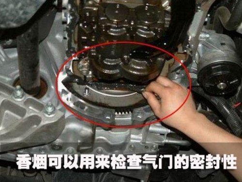 檢查氣門密封性可用吹煙法檢查氣門與氣門座的密封性。把研磨好的氣門洗凈并按順序放入氣門導管內(nèi),用手或合適的工具(如螺絲刀桿)頂住氣門,然后吸一口煙,向已經(jīng)洗凈的進氣岐管口和排氣岐管口吹煙,以嘴貼合岐管口不泄漏為原則。同時觀看氣門與氣門座之間是否有煙冒出來,如沒有煙冒出,則說明該氣門密封性良好,否則應重新研磨。