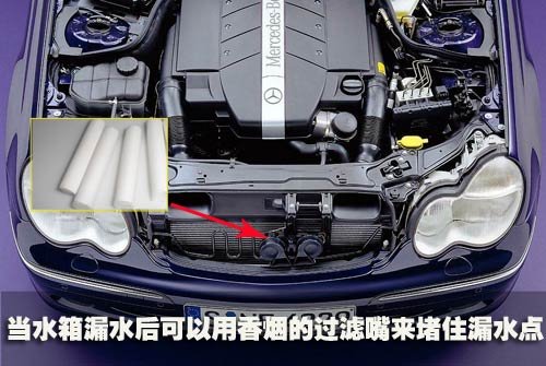 煙絲可堵漏在行車途中如果遇到水箱漏水可用煙絲來臨時應急。首先用手鉗將水箱漏水較大的散熱片夾扁,然后擰開水箱加水口蓋,同時拆下節(jié)溫器(以防堵塞),接著將煙絲揉碎,從加水口處入水箱中,最后起動發(fā)動機,分別用低、中、高速運轉(zhuǎn),這樣放入的煙絲就會被吸附在水箱芯管漏水處。當察看到水箱漏水被堵住后,蓋好加水口蓋,即可行駛。但需要注意的是這只能是用作應急,回場后應用高壓水清洗并徹底焊修水箱。