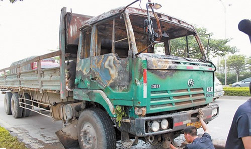 駕駛室被燒毀,工人正準(zhǔn)備將起火的貨車掛上拖車。