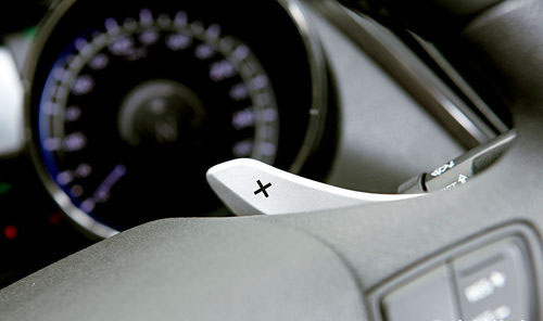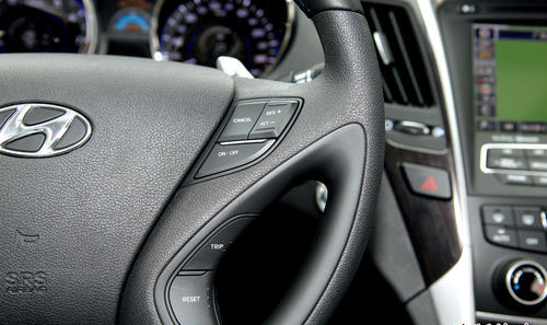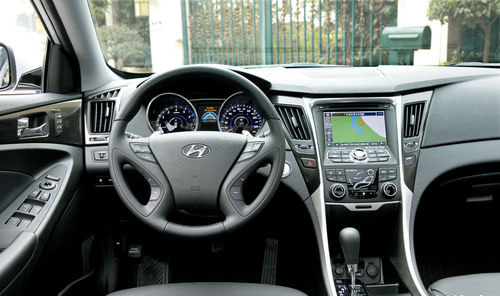 多功能方向盤與車頭線條一致,都融入了"X"造型,真皮與塑料結(jié)合的搭配使方向盤手感不錯,換擋撥片的出現(xiàn)讓新索納塔在操作方面也更貼近運動風格,而美中不足的是方向盤調(diào)節(jié)的角度有限,即使把座椅降到最低,方向盤調(diào)到最高,手握方向盤時的位置依然比較低,不夠順手,在激烈駕駛時帶來的不便尤為明顯。好在7英寸觸摸屏、導(dǎo)航、藍牙電話、恒溫空調(diào)、Infinity 5.1聲道音響、一鍵啟動、iPod USB接口等配置一應(yīng)俱全,以自己的方式詮釋了韓式豪華。
