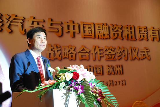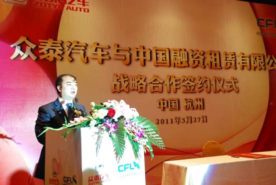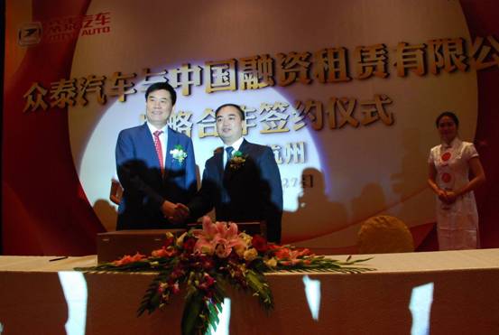 2011年5月27日上午,眾泰控股集團(tuán)與中國融資租賃有限公司戰(zhàn)略合作協(xié)議簽約儀式在杭州西湖香格里拉大酒店隆重舉行。中國融資租賃有限公司總裁劉平、眾泰控股集團(tuán)董事長吳建中、杭州市經(jīng)委等相關(guān)領(lǐng)導(dǎo)出席簽約儀式。眾泰汽車董事長吳建中與中融租賃總裁劉平簽署了戰(zhàn)略合作協(xié)議。此次締盟,雙方將開創(chuàng)強(qiáng)強(qiáng)聯(lián)合、優(yōu)勢互補(bǔ)、互利共盈的新局面。