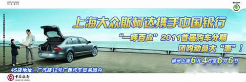 2、斯柯達(dá)攜手中國銀行“一呼百應(yīng)”2011首屆購車分期、團(tuán)購動員大“惠”專場團(tuán)購促銷:針對中國銀行內(nèi)部員工及客戶進(jìn)行貸款和現(xiàn)金現(xiàn)車銷售活動