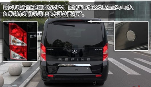 三角形和平行四邊型組合的尾燈也很有創(chuàng)意,讓人過目不忘;瑞風(fēng)的尾部則依舊呼應(yīng)前臉飽滿的感覺,整體和細(xì)節(jié)的設(shè)計很圓潤,家用風(fēng)格依舊。和暢與瑞風(fēng)間的差別還體現(xiàn)在車標(biāo)的設(shè)計上,瑞風(fēng)較為普通的設(shè)計樣式,被更加高調(diào)的車標(biāo)和醒目的“REFINE”所取代。