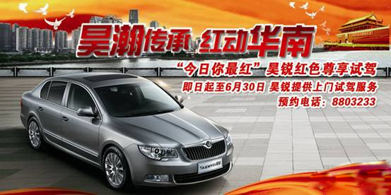 隨著黨的90周歲生日臨近,上海大眾斯柯達(dá)柳州上源開展“昊涵傳承 紅動(dòng)華南”專題活動(dòng),即日起至6月30日止,您只要撥打“今日你最紅”昊銳紅色尊享上門試駕服務(wù)熱線報(bào)名,就可以獲得柳州上源公司提供的上門試駕斯柯達(dá)昊銳服務(wù)。