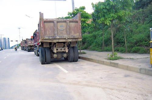 泥頭車封蓋大限在即,但近日記者走訪南寧不少工地發(fā)現(xiàn),大多數(shù)泥頭車仍在敞開跑,撒漏現(xiàn)象仍然存在,部分路段相當(dāng)嚴(yán)重。很多泥頭車即使連臨時性過渡措施——加蓋油布?xì)稚w都沒采取。對于封蓋大限,眾多泥頭車仍在觀望之中。