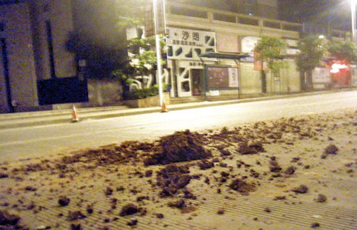 6月初某日凌晨3時多,鳳嶺片區(qū)不少道路上,泥頭車撒漏泥土嚴(yán)重。
