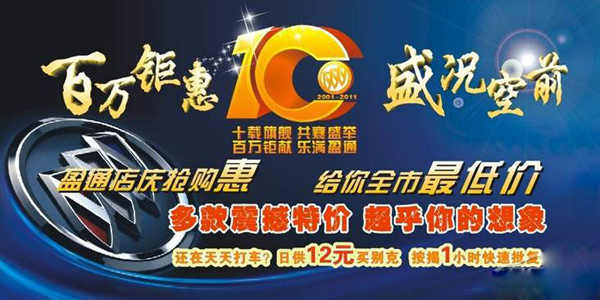 為回饋廣大客戶及車友。2011年6月9日-30日:凡到店試駕均有清涼好禮贈送;訂車除享受正常讓利優(yōu)惠外,還額外獲贈3000-5000不等的“盈通十周年店慶神秘大禮”,凡活動期間訂車購車即可參與“訂車有禮送 幸運(yùn)驚喜轉(zhuǎn)不!背楠(jiǎng)活動,獎(jiǎng)品豐厚,驚喜無限;優(yōu)選客戶辦理貸款尊享1小時(shí)批復(fù)政策,首付方式靈活,日供低至12元/天;針對別克車主,店慶期間回站消費(fèi)滿500元或參加空調(diào)護(hù)養(yǎng)套餐即可參與店慶抽獎(jiǎng)活動,百分百中獎(jiǎng)。