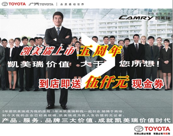 (廣西汽車網(wǎng) 訊)據(jù)媒體了解后反饋,凱美瑞是目前世界上最為成功的中高級車之一,全球銷量已經(jīng)突破了1300萬輛。自2006年中國上市以來,一直引領(lǐng)著中高級車市的發(fā)展方向。今年2011年,是凱美瑞上市五周年,廣汽豐田迅利江南店為為了在這個喜慶的日子回饋廣大消費者,決定在6月15日-6月30日,在店內(nèi)舉辦凱美瑞上市五周年慶活動。