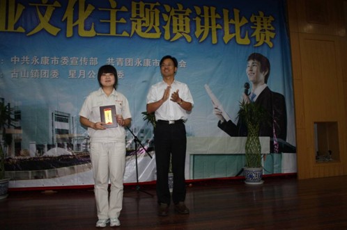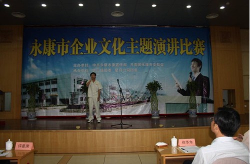 2011年6月7日下午,永康市企業(yè)文化主題演講比賽在市行政會議中心舉行,全市共有16名選手參加比賽,其中我集團(tuán)眾泰制造物流中心陳莎莎演講的“我的成長我的路”發(fā)揮最佳,贏得全場觀眾的一陣陣掌聲,勝利奪冠,榮獲一等獎,永康市委副書記徐華水親自為其頒獎;銷售中心網(wǎng)絡(luò)管理部趙飛演講的“企業(yè)與我共成長,我與企業(yè)共榮辱”獲得三等獎,眾泰制造總裝部黎繼鵬演講的“平凡崗位鑄輝煌”獲得優(yōu)勝獎。
