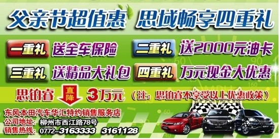 近日,編輯從柳州華匯東風(fēng)本田4S店了解到,東風(fēng)本田父親節(jié)超值惠,思域暢享四重大禮,思鉑,F(xiàn)金大優(yōu)惠,最高優(yōu)惠30000元,喜歡的朋友可到店咨詢(xún)了解: