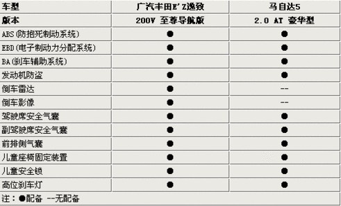 兩車在安全性上表現(xiàn)均非常出色,ABS、EBD、BA等主動(dòng)安全配置一個(gè)不落,前排氣囊和前排側(cè)氣囊也是均有配備。不過(guò),逸致配備的倒車影像系統(tǒng)讓其在與馬自達(dá)5的較量中得以勝出。