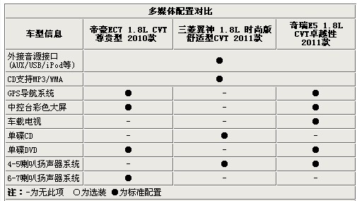 多媒體方面配置方面,奇瑞E5做得是最出色的,這也是E5除了倒車影像和前后泊車雷達外,表現(xiàn)較好的地方,其中中控臺液晶屏除了影音娛樂功能外,還具有導航和同級中罕見的數(shù)字電視功能,并且具有科技感較強的可觸摸操作,不給力的是他的揚聲器數(shù)量居然是4個,這無疑令其影響功能大打折扣;EC7次之,翼神因為其合資身份的以及運動型的定位在這方面的配備投入得很少~