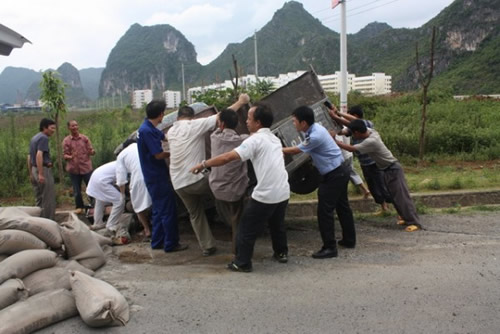 如不及時(shí)將傷員救出,將有可能因失血過(guò)多造成生命危險(xiǎn)。而要想救出傷者,必須將壓在傷者腿上的車(chē)廂抬起,可現(xiàn)場(chǎng)的人手不夠,怎么辦?面對(duì)這一情況,經(jīng)驗(yàn)豐富的帶隊(duì)民警馬上想到了一套切實(shí)可行的援救方案,那就是請(qǐng)求圍觀和過(guò)路群眾的支援!為防止二次事故的發(fā)生,民警迅速封鎖現(xiàn)場(chǎng)車(chē)道,并向過(guò)往的群眾尋求幫助,路過(guò)的群眾一聽(tīng)是救人,都紛紛趕來(lái)幫忙,在民警的指揮協(xié)調(diào)下,眾人首先將車(chē)廂上的水泥搬運(yùn)下車(chē),隨后一起合力把整個(gè)車(chē)廂抬起,被困司機(jī)黃某終于成功獲救,并被送往醫(yī)院。