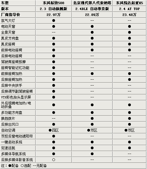 標(biāo)致508在舒適性配置方面相對于索納塔和K5要稍占上風(fēng),氙氣大燈酷勁十足,后排大燈座椅、駕駛席座椅按摩、座椅記憶、后排中央扶手、電動(dòng)遮陽簾、后排座椅加熱以及四區(qū)獨(dú)立空調(diào)體現(xiàn)出的商務(wù)氣息十分濃重,極具特色的抬頭顯示屏實(shí)用型非常高;索納塔與K5的表現(xiàn)也是足夠出色,三片式全景天窗絕對會(huì)俘獲很多人的心,換擋撥片的配備讓您在駕駛中會(huì)感到無比的新潮澎湃。