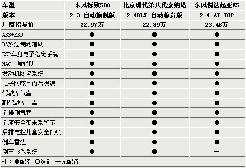 三款車在安全性上表現(xiàn)均非常出色,ABS+EBD、BA、ESP、HAC等主動(dòng)安全配置一應(yīng)俱全,前排4氣囊也是不可或缺,標(biāo)致508與索納塔配備的倒車影像系統(tǒng)十分清晰,加入的倒車輔助線大幅提高了實(shí)用性。