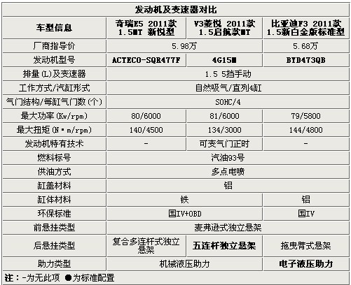 三款車型都采用了單頂置凸輪軸4每缸4氣門的結(jié)構(gòu),具有低轉(zhuǎn)速下進(jìn)氣慣性小,機(jī)械結(jié)構(gòu)簡單等特性。奇瑞與奧地利AVL合作的ACTECO1.5L發(fā)動機(jī)采用了SOHC(單頂置凸輪軸),順應(yīng)了小排量發(fā)動機(jī)低轉(zhuǎn)速、高扭矩的趨勢。V3采用了可變氣門正時三菱的改進(jìn)的4G15M發(fā)動機(jī),而F3采用的是自主研發(fā)的BYD473QB發(fā)動機(jī),三款車動力匹配不分伯仲,所以三車性能表現(xiàn)較為均衡;三款車均用93號汽油,前兩者采用了鑄鐵材質(zhì)發(fā)動機(jī),后者采用的是散熱更好、重量更輕的鋁制發(fā)動機(jī);三者中除F3外均采用了舒適性更好的多連桿獨(dú)立后懸架,但電子液壓助力的應(yīng)用更節(jié)省F3的發(fā)動機(jī)動力。