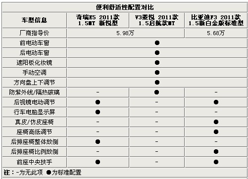 三車均有采用了前后四門電動車窗,雖然成本不高,但是比較貼心的配備;尤贊的是V3菱悅采用了這個級別中較少的防紫外線隔熱玻璃,更加提供空調(diào)的效能;V3菱悅?cè)鄙匐妱油夂笠曠R調(diào)節(jié)功能比較的不方便;三款車只有新上市的E5采用了倍感呵護(hù)的行車電腦顯示屏;帶有高低調(diào)節(jié)的真皮座椅的配備成就了F3低價高配美名;E5和F3后排座椅都能放倒置物,只是F3可拆折疊座椅表現(xiàn)車更好的空間利用率;前后中央扶手較少了司機(jī)長途駕駛的疲勞感,這項(xiàng)配置同樣為E5和F3所擁有。