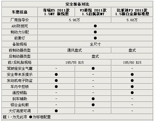 三車都配備了ABS+EBD主動安全配置,其中V3還配備了剎車輔助,更加提高了主動安全性;都使用了安全性更好的前后盤式剎車,因?yàn)榍膀?qū)車75%制動力都集中在前輪,所以E5和V3使用了熱衰減更好的前盤式剎車;三車中F3采用了舒適性更好的195/60 R15的厚胎壁設(shè)計,V3使用了更加美觀和使用的鋁合金輪圈;E5和F3配備的安全帶未系提示和V3的副駕駛安全氣囊部分伯仲;V3沒有配備發(fā)動機(jī)電子放倒這項(xiàng)安全配置,所以用戶應(yīng)更加妥善停放自己的愛車;遙控鑰匙這項(xiàng)奢侈配置為F3所獨(dú)享;新近上市的E5配備了大燈高度可調(diào)系統(tǒng),更加的方便車身在前后配重不同情況下提高照明安全性~