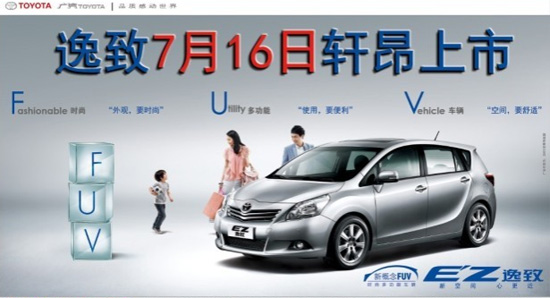 (廣西汽車網 訊)據廣汽豐田廣緣店獲悉,廣汽豐田為中國消費者精心打造的首款FUV車型E’Z逸致,將于2011年7月16日上午10點半,在廣汽豐田廣緣店舉行隆重的上市儀式,到店參加上市儀式的客戶,均可獲得精美豪禮一份,現(xiàn)場還有精彩的活動表演,及精心打造的模特泳裝秀,現(xiàn)場購車,還有驚喜好禮相送。