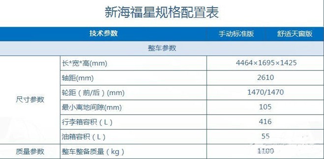 編輯從海馬?凳昀吓频炅私獾,新款海福星車型于2011年7月18日全國上市。此次推出的新海福星兩款車型售價分別為手動舒適型售價5.98萬,手動豪華型售價6.68萬,全部搭載全新1.3L排量發(fā)動機。新海福星將以三大突破、“五!辟u點,打造中國人的“幸福可靠車”。