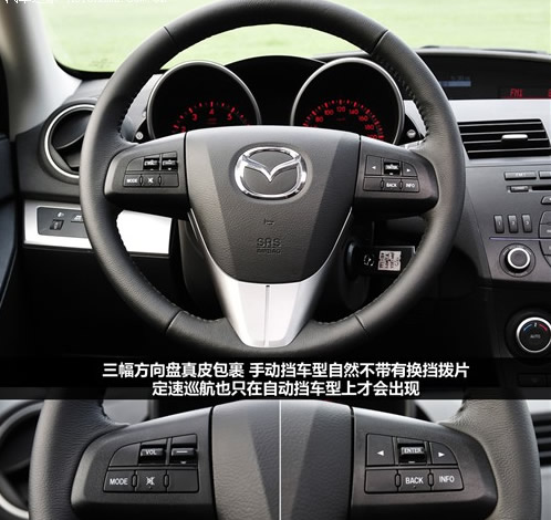 內(nèi)飾整體也與之前車展上看到的展車相同,與兩廂車型保持了一致,較為年輕運動。真皮三輻方向盤手感不錯,手動擋車型方向盤只集成音響和行車電腦控制,而自動擋還帶有換擋撥片和定速巡航。