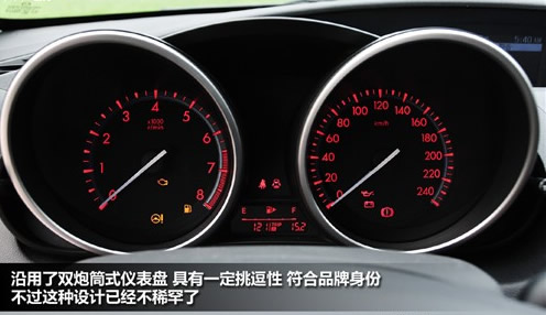 透過方向盤我們看到的依然是雙炮筒儀表盤,使用紅色背光,運動感強烈,可是這種設(shè)計已經(jīng)并不稀罕了,不像當(dāng)年那樣能有轟動效應(yīng)了。