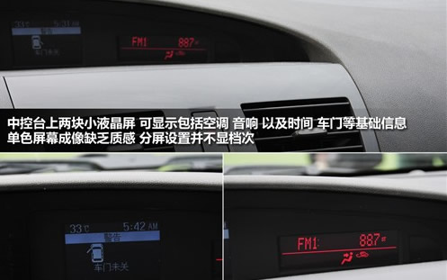 視線向右平移,順著中控臺的弧線我們看到兩塊小液晶屏,分別顯示一些車輛的基本信息,比如音響、空調(diào)等,但是單色的屏幕看上去并不顯得高檔,圖像質(zhì)感不強烈,而且分屏顯示每塊屏幕又很小,不如整塊液晶屏顯檔次。
