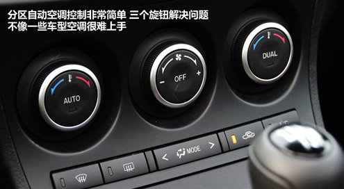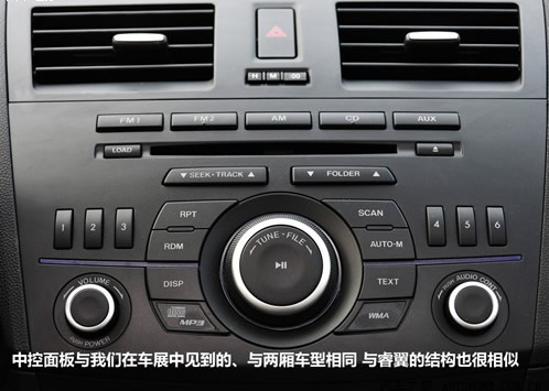 中間部分很有馬自達(dá)的設(shè)計特點,音響和空調(diào)控制區(qū)域分區(qū)明顯。兩個區(qū)域相比較空調(diào)的操作明顯更容易上手,三個旋鈕解決問題,不像有些車空調(diào)很難用,想調(diào)節(jié)風(fēng)量還得琢磨下。音響控制區(qū)的布局可能稍顯復(fù)雜。
