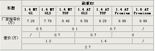 在K2發(fā)布的7款車型中,從配置上分為GL、GLS、TOP以及Premium四種。其中GL為入門級車型,Premium則是K2的旗艦型車。價格上,K2的價格區(qū)間為7.29-9.99萬元,低配車型與旗艦車型相差2.7萬,相同配置下,手動車型與自動車型的差價達8千元,而1.4L旗艦車型與1.6L旗艦車的售價則保持一致。