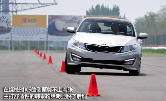 K5采用前麥弗遜后多連桿獨立懸掛形式,底盤調教以舒適性為主,但在彎道也能給車輛足夠的支撐,從圖中的繞樁時K5的車身姿態(tài)看,側傾的幅度也并不是十分夸張。但以舒適性為主的韓泰輪胎明顯有些拖后腿,這讓K5最終的繞樁成績并不是十分理想。