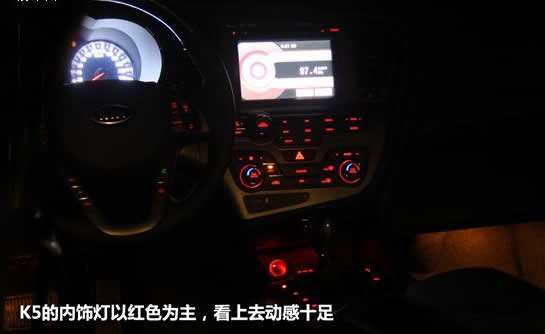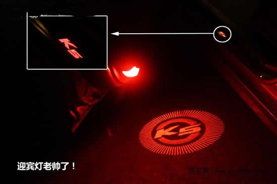 K5的氛圍燈設(shè)計(jì)很有意思,除了傳統(tǒng)的燈光外,K5的迎賓燈設(shè)計(jì)相當(dāng)搶眼,鮮紅的K5標(biāo)致在晚上看起來非常上檔次,同樣的設(shè)計(jì)之前就曾出現(xiàn)在智跑上。