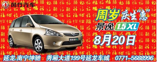 在眾多新老客戶及廣大車友關心于支持下,南寧坤馳的銷量也是一路攀升,為感謝關心風行品牌、以及支持我們本土品牌的朋友們,南寧坤馳風行汽車4S店8月20日下午14:00, 景逸周歲慶生“惠”,同邀新老客戶及廣大車友參加,共同感受景逸的成長。