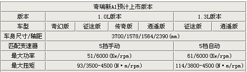 奇瑞A1于2007年上市的一款以外觀和諧、配置實(shí)用而聞名的小型車(chē),經(jīng)歷了2009年小改款之后,第二次改款車(chē)型也即將與我們見(jiàn)面。本次改款外觀基本上沒(méi)有變化,主要變化體現(xiàn)在內(nèi)飾方面以及新增1.0L車(chē)型,預(yù)計(jì)推出六個(gè)版本的車(chē)型。具體詳情見(jiàn)下表: