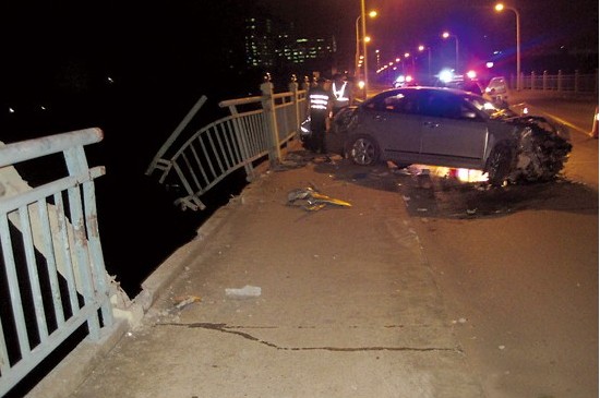 據(jù)負(fù)責(zé)現(xiàn)場(chǎng)勘查的民警分析,事發(fā)時(shí)轎車先是一頭撞上橋欄的一個(gè)欄墩,然后沿著防護(hù)欄旋轉(zhuǎn),被另一欄墩擋住后轉(zhuǎn)了個(gè)圈才停下,加上兩個(gè)大欄墩及鐵欄比較粗大,才擋住轎車沒(méi)有跌進(jìn)江中。
