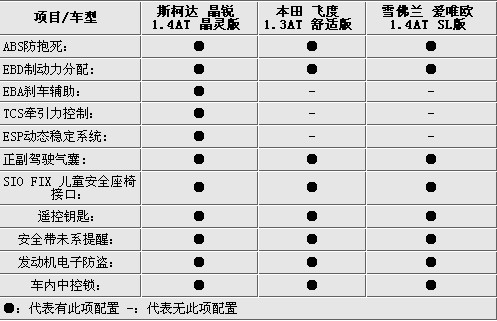 安全配置方面斯柯達晶銳的配置最高標配了ESP車身穩(wěn)定系統(tǒng)和TCS牽引力控制系統(tǒng)。三合一剎車(ABS+EBD+EBA)裝備齊全。在主動安全方面是3款車型中最為豐富的車型。飛度和愛唯歐僅提供最基本得ABS防抱死和EBD制動力分配安全功能。在被動安全方面3車持平,都使用了前排氣囊,還有都可以安裝SIO FIX兒童安全座椅接口。