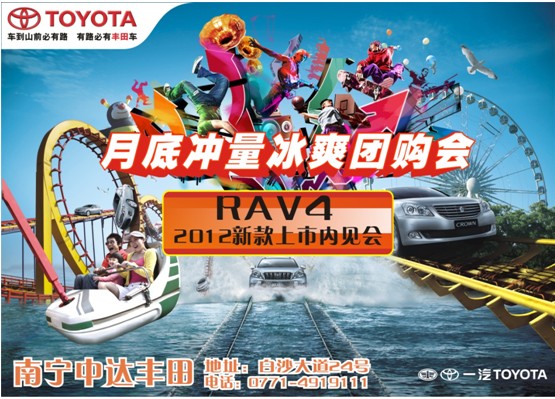 火熱八月,沖量冰點(diǎn)價(jià)格點(diǎn)燃購車激情,南寧中達(dá)豐田邀您8月27日參與“月底沖量冰爽團(tuán)購會(huì)暨2012新款RAV4上市內(nèi)見會(huì)”。位于白沙大道24號(hào)的南寧中達(dá)豐田特備冰爽飲料水果甜品供您免費(fèi)品嘗。月底沖量,冰點(diǎn)價(jià)格大放送,您將有機(jī)會(huì)提前享受車展最優(yōu)價(jià)——全系優(yōu)惠近萬元,卡羅拉最高優(yōu)惠15000元。年度價(jià)格觸底,盡請關(guān)注。