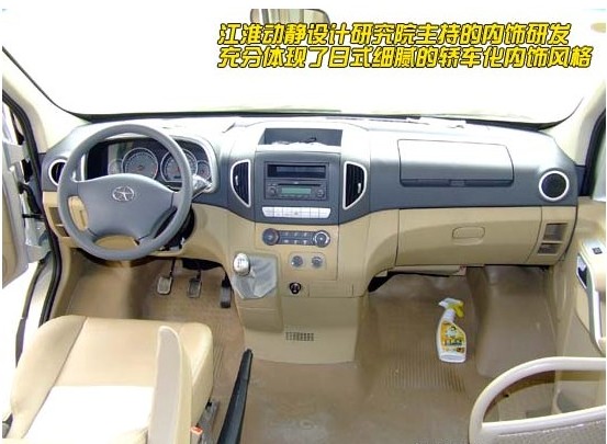 內(nèi)部裝飾上則是由江淮日本東京設(shè)計研究院主刀,有明顯的轎車風(fēng)格。典型的轎車一體式中控局部看上去完全不會認為這是一款輕客商用車,并且配置上也是向著轎車靠攏,車載GPS、DVD及倒車影像系統(tǒng)加強了娛樂服務(wù)功能,而ABS、EBD以及氣囊的配置則加強了被動安全性能?梢哉f星銳整部車同時具備了歐陸風(fēng)格的時尚及日式細膩的內(nèi)部裝飾,在硬件上具備了與依維柯、全順一爭市場的能力,而不到20萬的價格,又避免會面臨奔馳sprinter那樣質(zhì)好價高帶來的曲高和寡的局面。