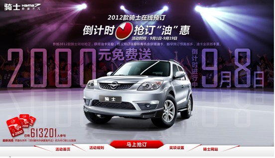 登錄獲得網(wǎng)站,http://qishi.haima.mediav.com/yuding/ 參與搶訂“油”惠。網(wǎng)上提交2012款騎士訂單后,前往海馬?凳昀吓频旰藢(shí)個人信息交納定金及簽署訂車協(xié)議等,即可在提車時獲贈油卡獎勵。
