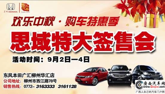 廣匯廣西機電歡樂中秋•特惠購車季活動已歡樂啟動,五百萬豪禮感恩回饋消費者。東本廣匯柳州華匯店特惠購車活動同步開啟,并于9月2-4日傾力打造思域總經(jīng)理簽售會回饋龍城客戶;顒悠陂g訂車除了能享受超低的優(yōu)惠政策,還能獲得額外的超級禮包!進店均有精美禮品相送,希望有想購買東風本田思域車系的朋友不要錯過這次優(yōu)惠的時機。