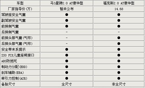 采用相同平臺的兩款車型在電子安全穩(wěn)定系統(tǒng)別無二致,ABS、EBD與ESP等配置應(yīng)有盡有。而近些年來日益受到關(guān)注的兒童座椅接口,兩車也均有配備。但唯一的不同出現(xiàn)在安全氣囊方面,不知是否處于成本問題,馬3星騁并沒有配備前后/排頭部氣囊,這不得不說是一個遺憾。雖然馬3星騁的備胎為全尺寸備胎,但這點與安全氣囊相比也只能了聊以自慰了。